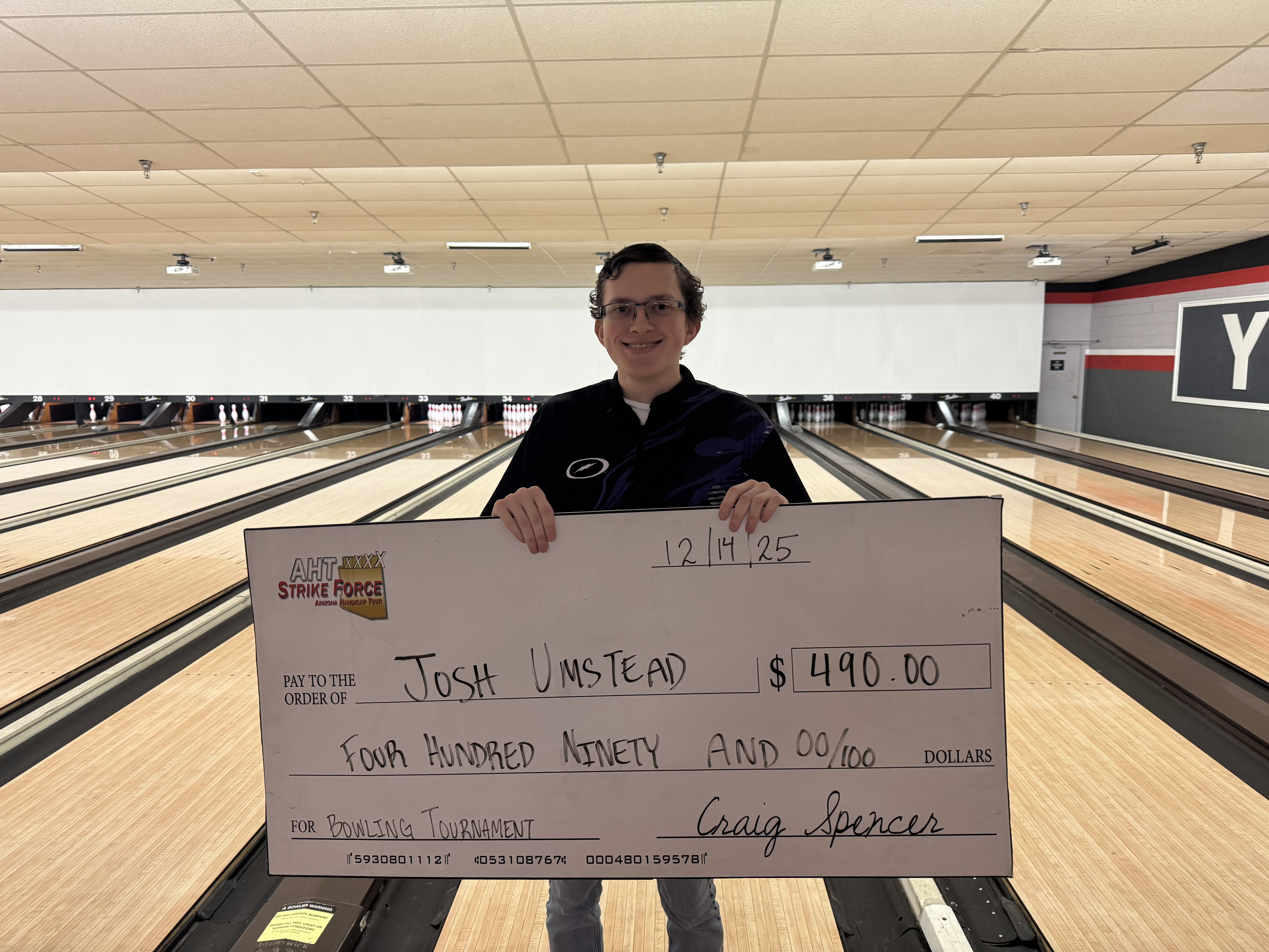 Our event this weekend was at Bowlero Kyrene and we had a lower turnout. We had a total of 43 entries (38 qualifying and 5 economy parlays) with 16 prize winners and a 1 in 2.68 cash ratio, paying out $2,195 in prize funds. The players bowled on the 40 ft Sphinx oil pattern that provided a medium-lower scoring pace throughout the event.