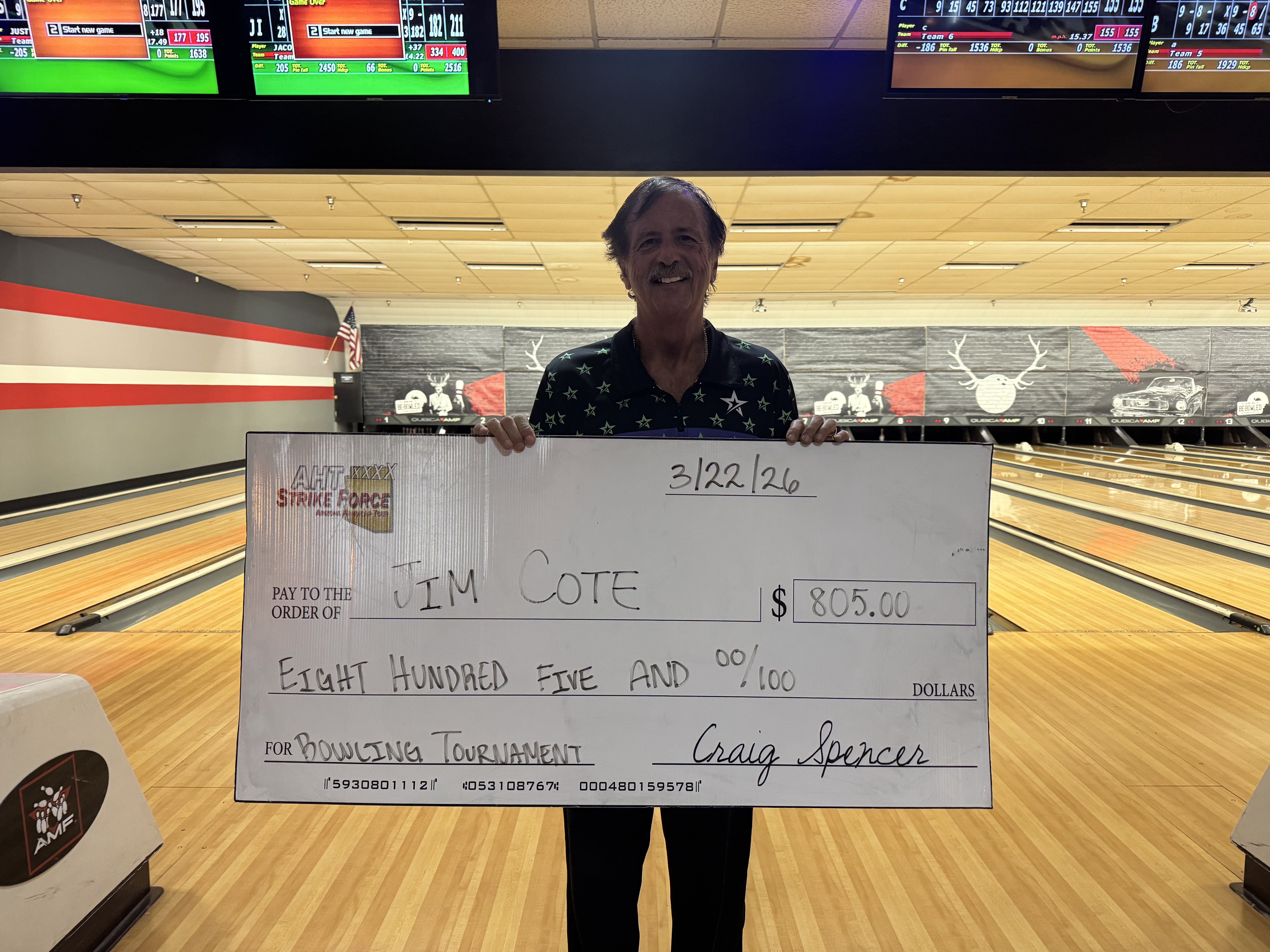 Our season opening event this weekend was at AMF Mesa and we had a decent turnout. We had a total of 63 entries (48 qualifying and 15 economy parlays) with 16 prize winners and a 3.94:1 cash ratio, paying out $2,900 in prize funds. The players bowled on the 35 ft Boardwalk V2 oil pattern that provided a medium scoring pace throughout the event, but those who had a look really took advantage on some games.